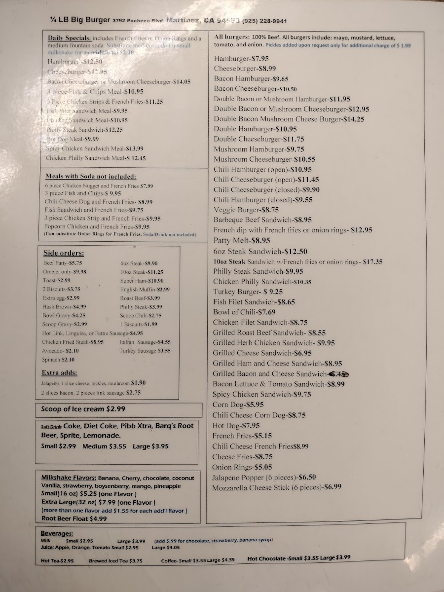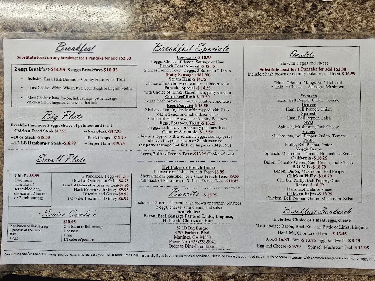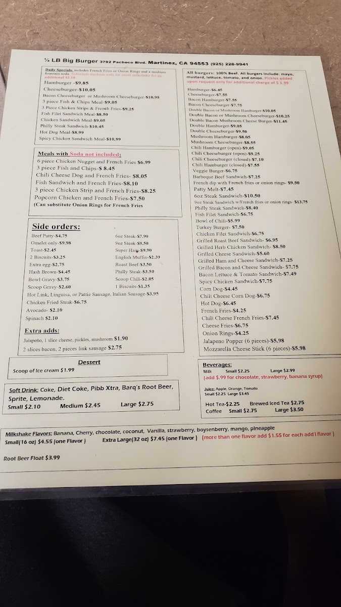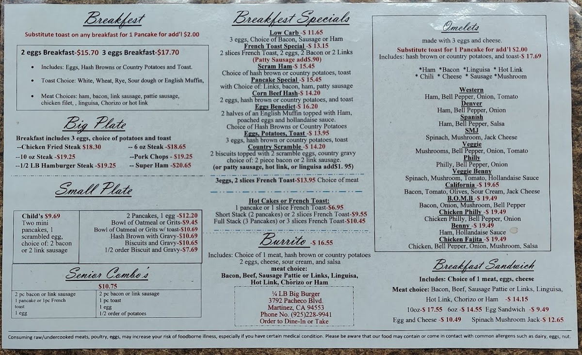 Welcome to 1/4 Lb Big Burger, a charming diner nestled in Martinez, CA. Known for its hearty offerings, this eatery is your go-to spot for satisfying breakfast and lunch dishes at any hour. The 1/4 lb burgers shine brightly on the menu, delivering a juicy, flavorful experience that locals rave about. Each burger comes perfectly cooked, complemented by a side of freshly made fries or crispy onion rings.