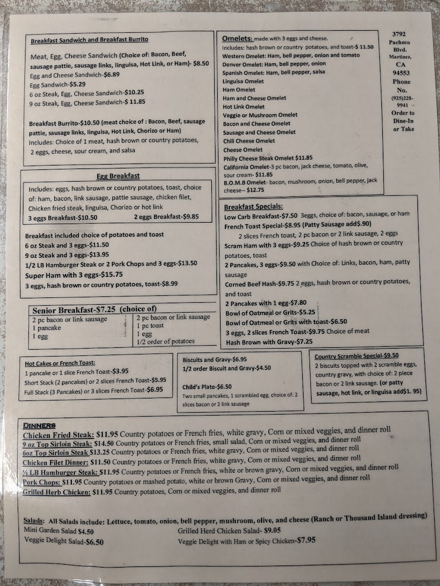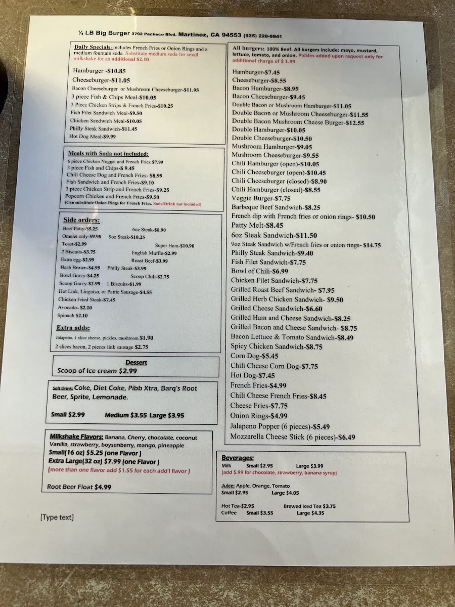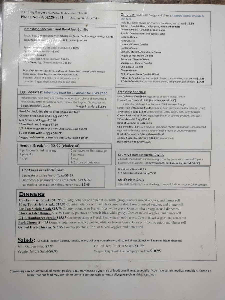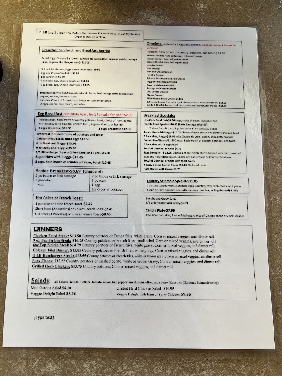 Welcome to 1/4 Lb Big Burger, a charming diner nestled in Martinez, CA. Known for its hearty offerings, this eatery is your go-to spot for satisfying breakfast and lunch dishes at any hour. The 1/4 lb burgers shine brightly on the menu, delivering a juicy, flavorful experience that locals rave about. Each burger comes perfectly cooked, complemented by a side of freshly made fries or crispy onion rings.